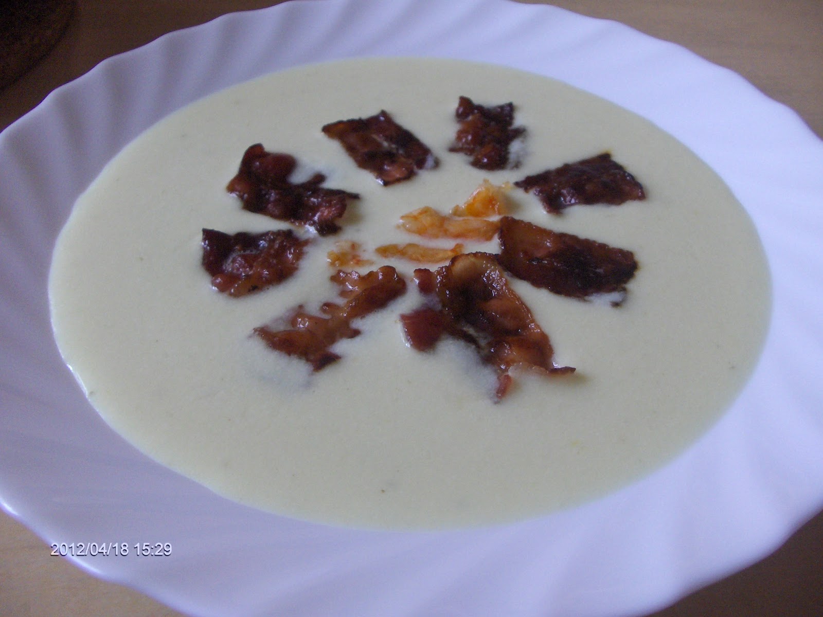 Majd felöntöttem 7 dl húsleves alaplével és 15 percig főztem. Amikor a spárga már puha volt, elővettem a botmixert és alaposan krémesre "daráltam" a hagymás spárgadarabokat.